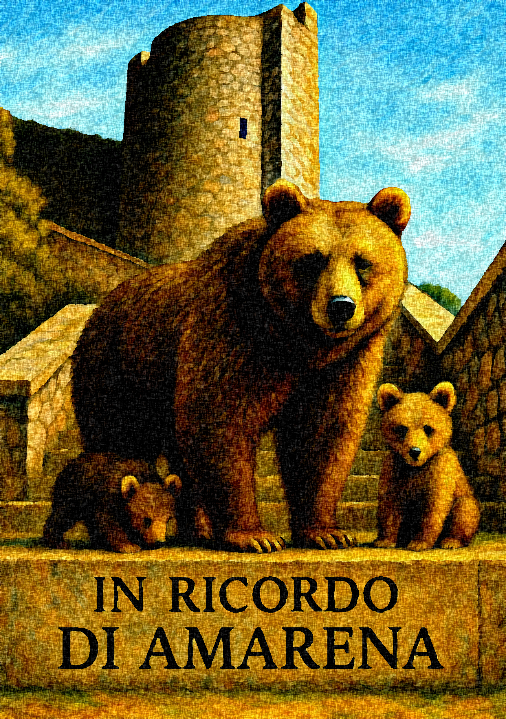 L’opera raffigura Amarena e i suoi cuccioli davanti al castello di Alfedena, in un’atmosfera sospesa tra realtà e memoria. La composizione, calda e luminosa, restituisce dignità e tenerezza al soggetto, trasformando il dolore per la sua uccisione in un messaggio universale di rispetto e consapevolezza.