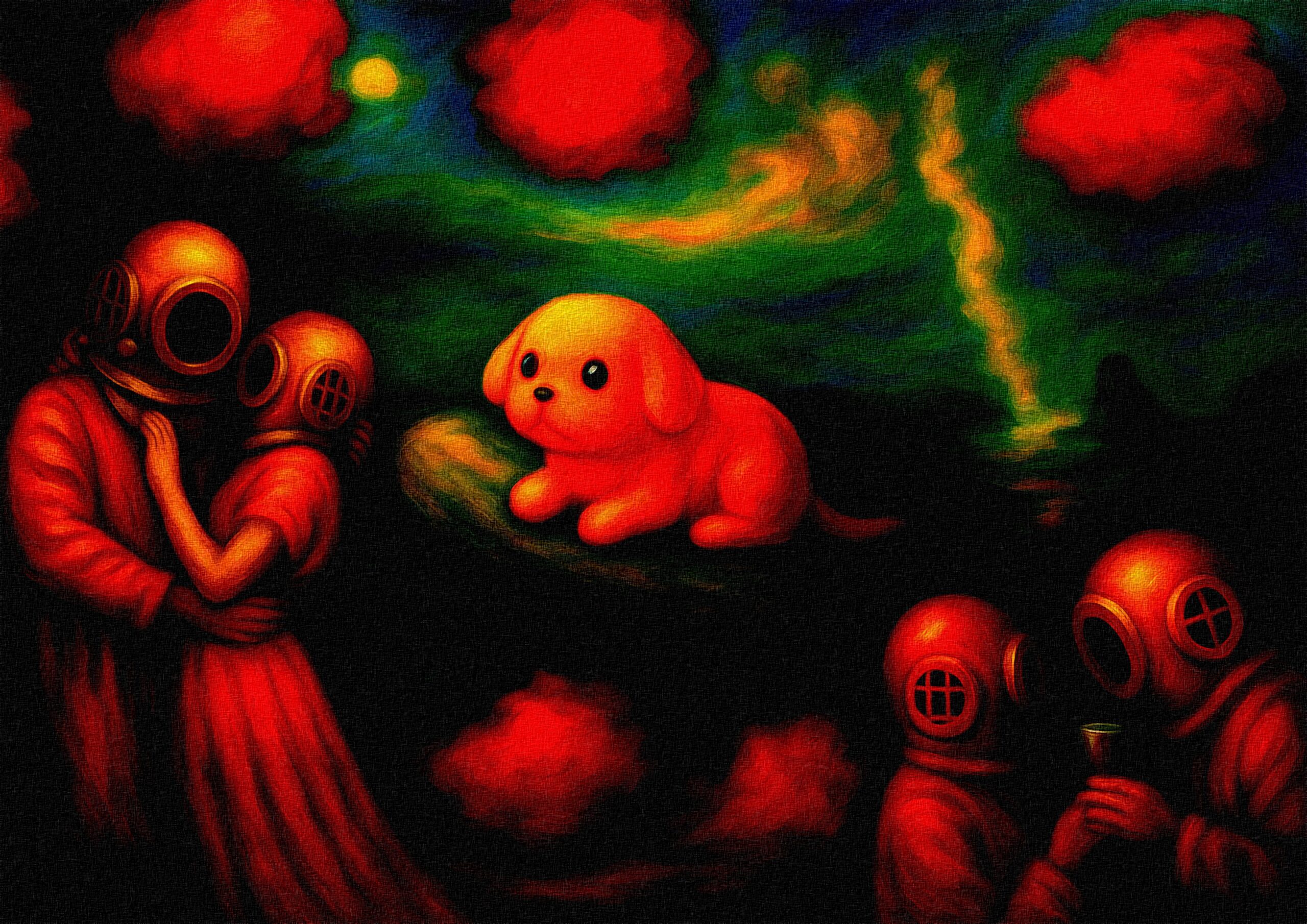 主人公の エイリアン・ドッグ は、神秘的でありながら優しさを持つ存在です。光と静けさから生まれた小さな犬のような姿をしており、別の星から来たのか、それとも人間の心の深い場所から現れたのかもしれません。どこに現れても、彼は「異なる純粋さ」の象徴であり、私たちの欲望や孤独の沈黙の証人となります。