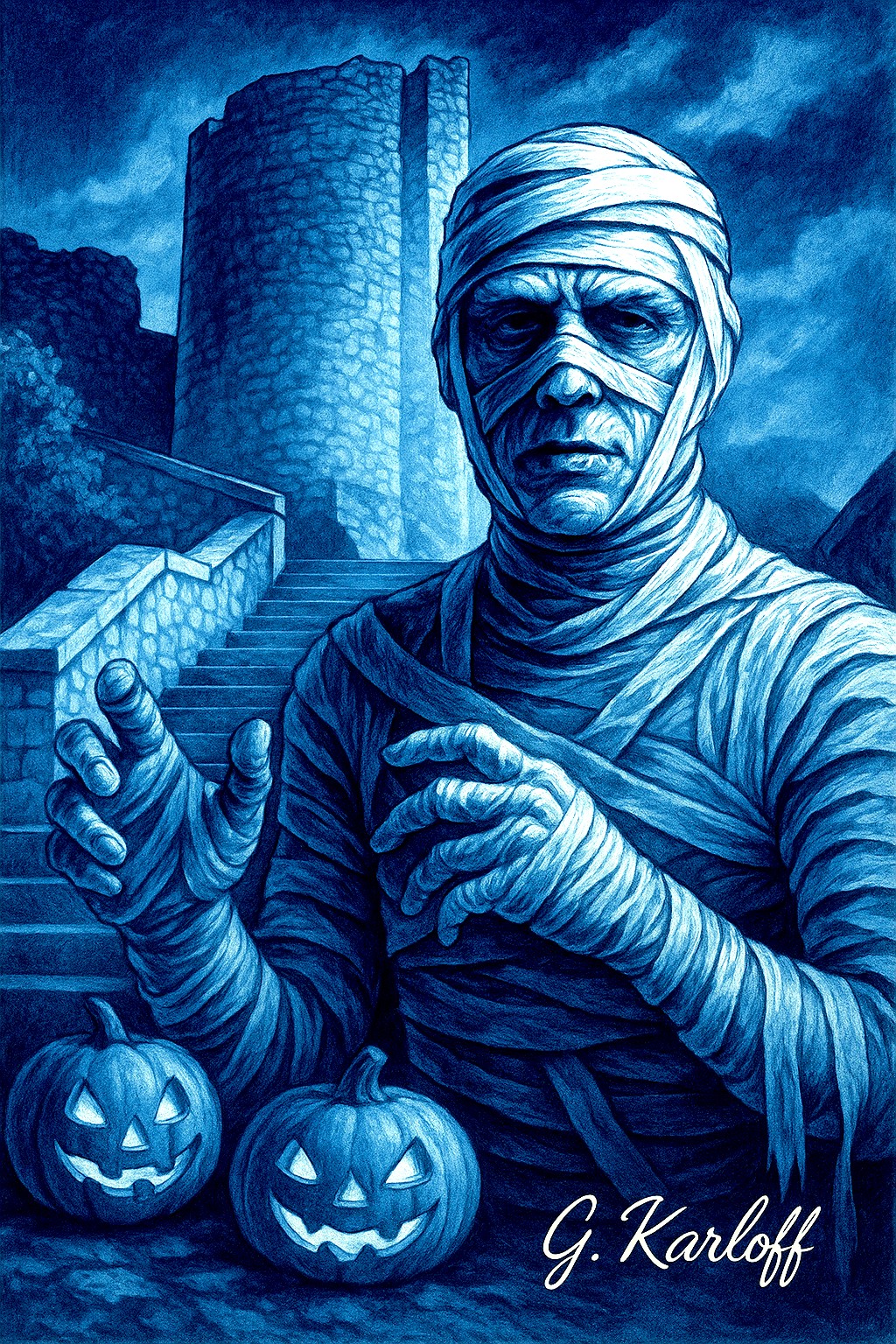 • The Mummy, guardian of time and memory, wrapped in a blue silence that evokes eternity.