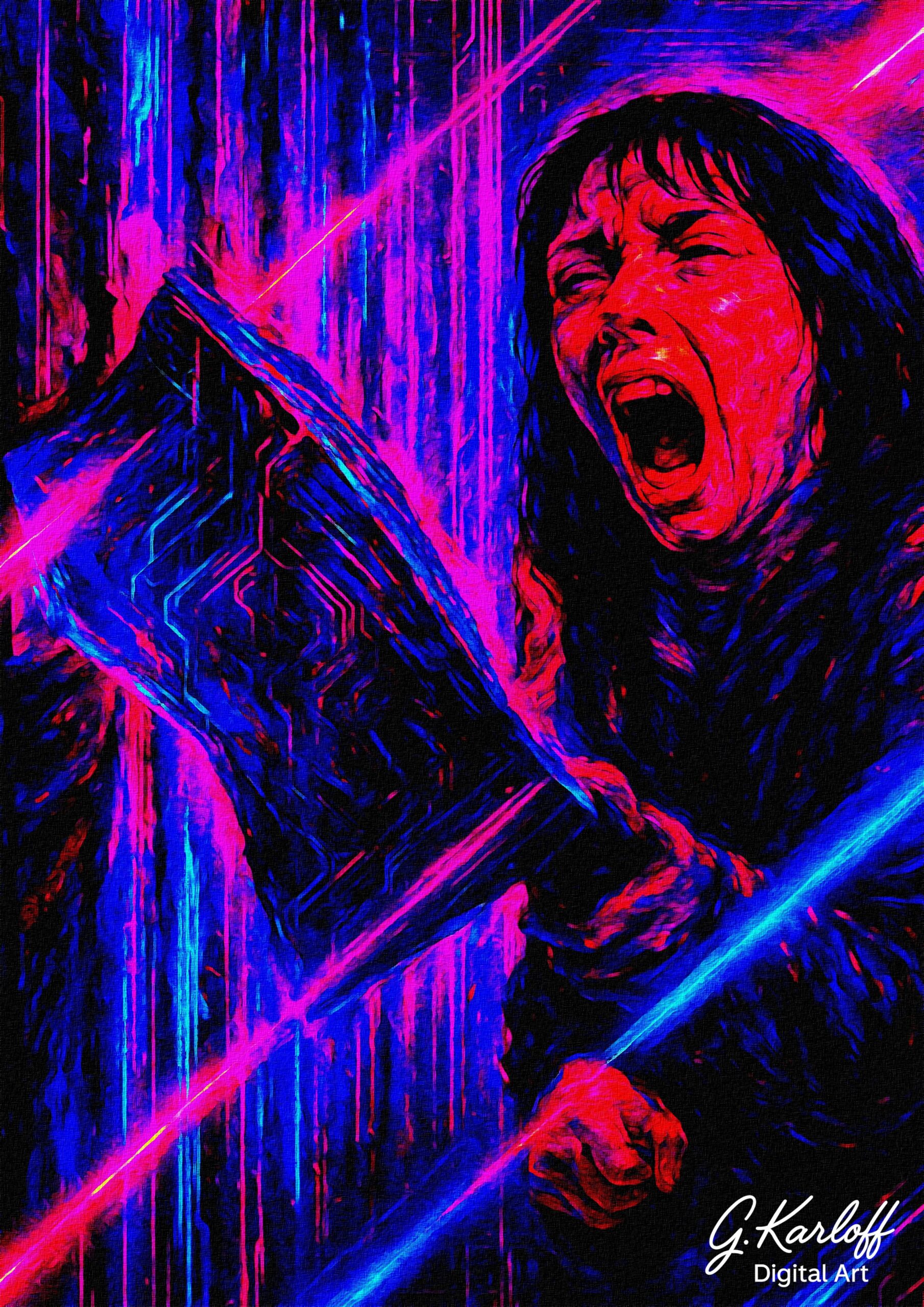 I chose to reinterpret it through digital Pop Art, using neon colors, strong contrasts, and glitch-inspired textures to capture that unsettling, hypnotic energy that the film has always carried.
