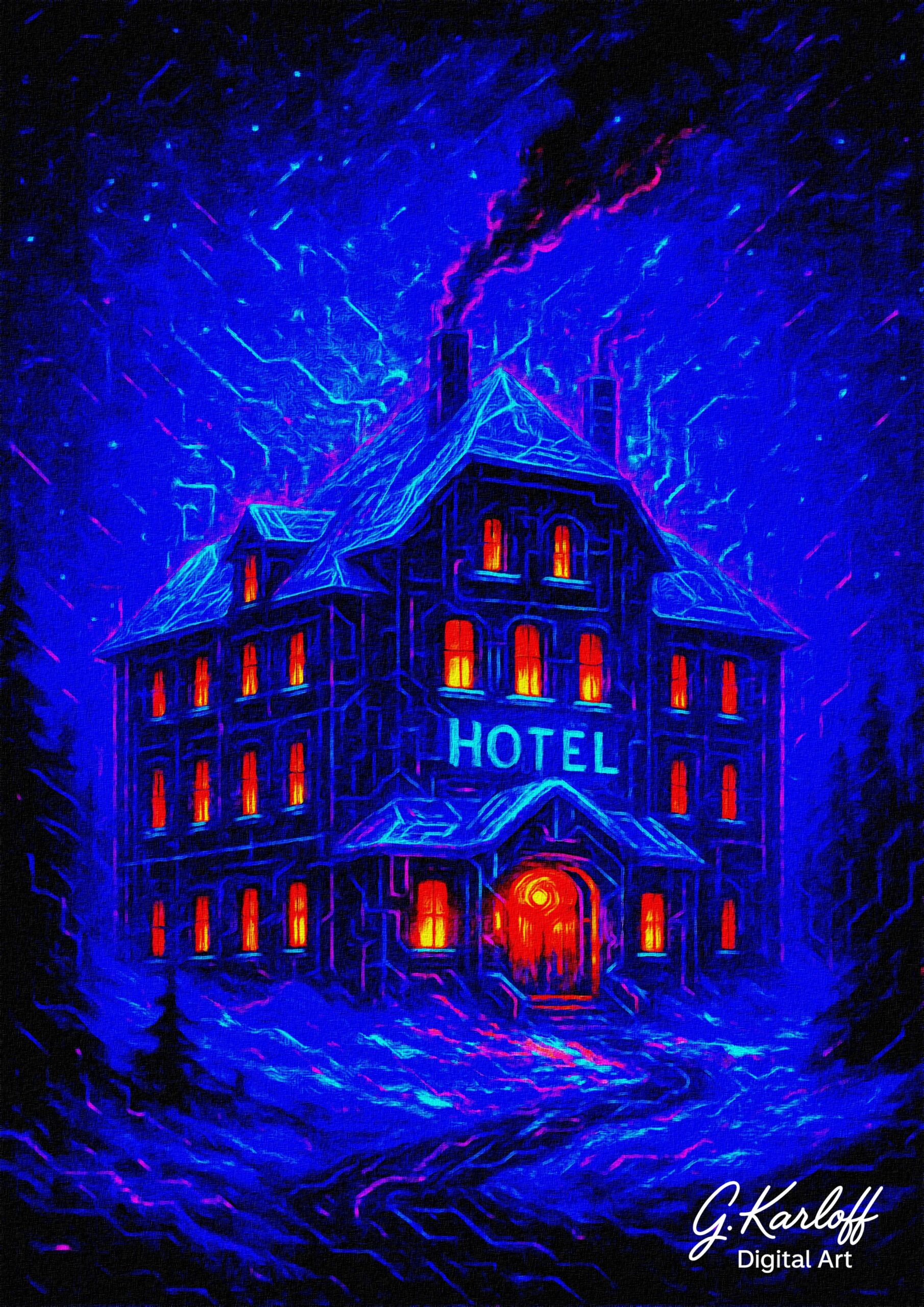 Das erste Bild, The Overlook Hotel, zeigt das Hotel als lebendige, atmende Kreatur. In meiner Version steht es in einem Sturm aus elektrischem Blau, die Fenster glühen in unheimlichem Rot. Ich wollte, dass es zwischen Traum und Albtraum schwebt – ein Ort, der den Betrachter verschlingen könnte.