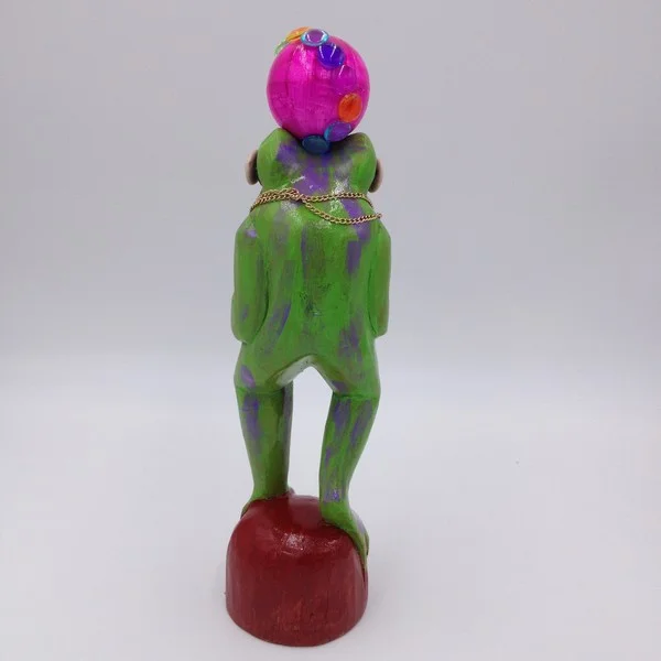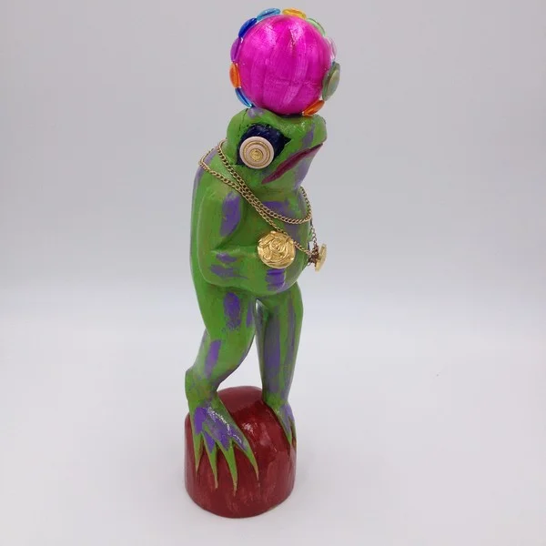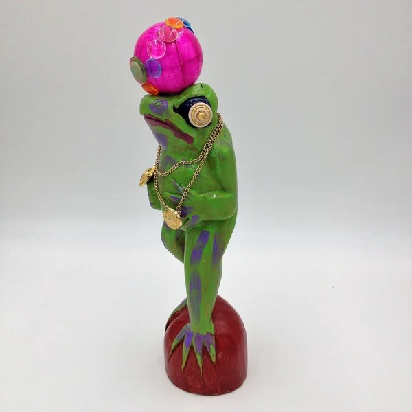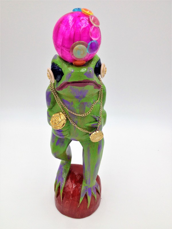 The Queen Froggy was born from my desire to give new life to materials destined for the landfill. I wanted to create a figure that is both ironic and regal: a frog in an almost human posture, painted in vivid colors and crowned with a bright pink sphere decorated with colorful plastic gems. The golden chains and metallic buttons symbolically represent luxury, wealth, and appearance — elements that often define power in our consumerist world.