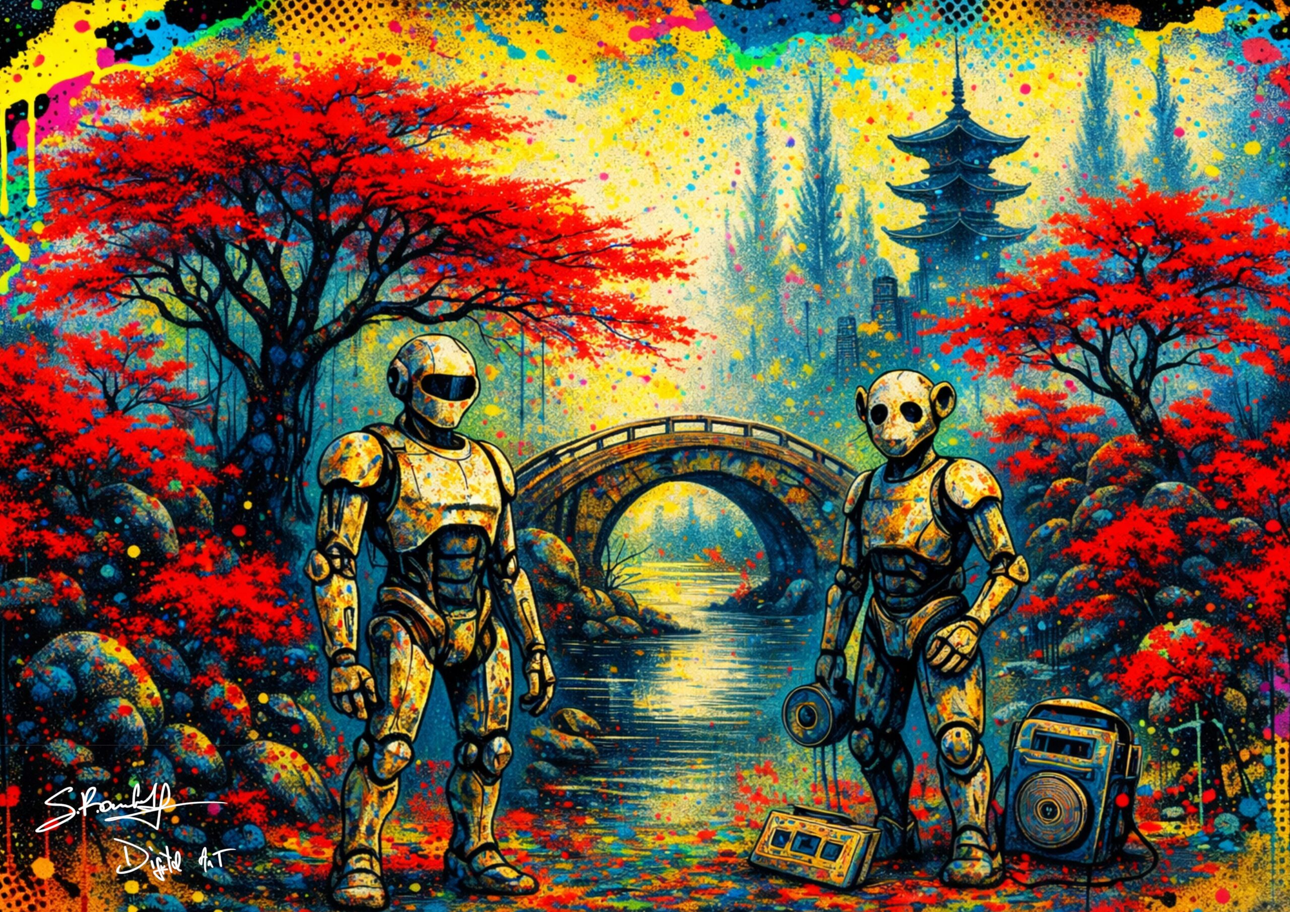 私は、自然とテクノロジーが互いを静かに見つめ合う、宙に浮いたような風景を思い描いた。二つの存在は単なるロボットではなく、沈黙した気配であり、過去と未来が同時に重なった世界の中に立っている。