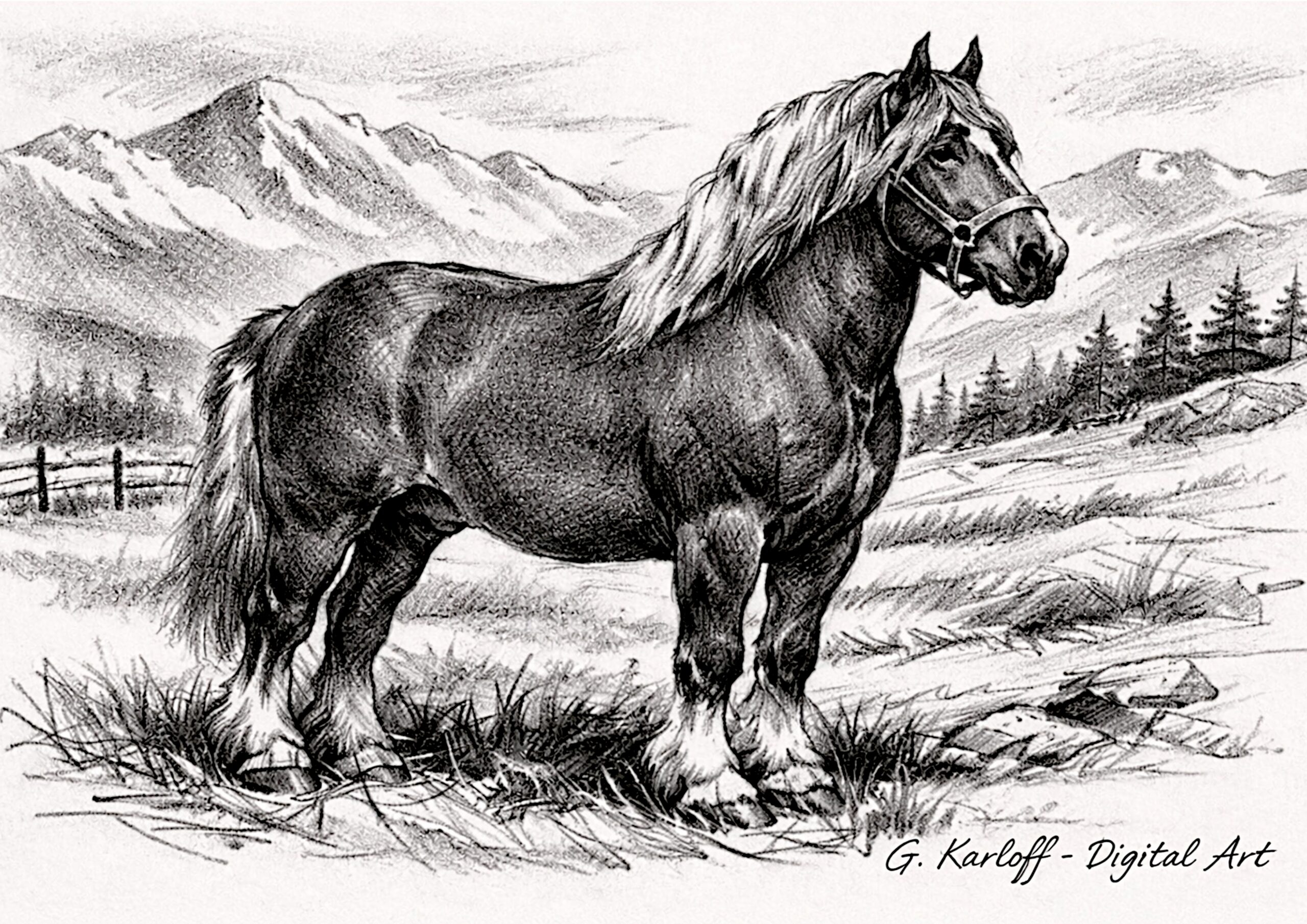 The Cavalli da tiro collection by G. Karloff represents a mature example of digital art, entirely hand-executed on a graphic tablet and subsequently modified with AI, in a conscious dialogue between painterly gesture, technological processing, and inner vision.