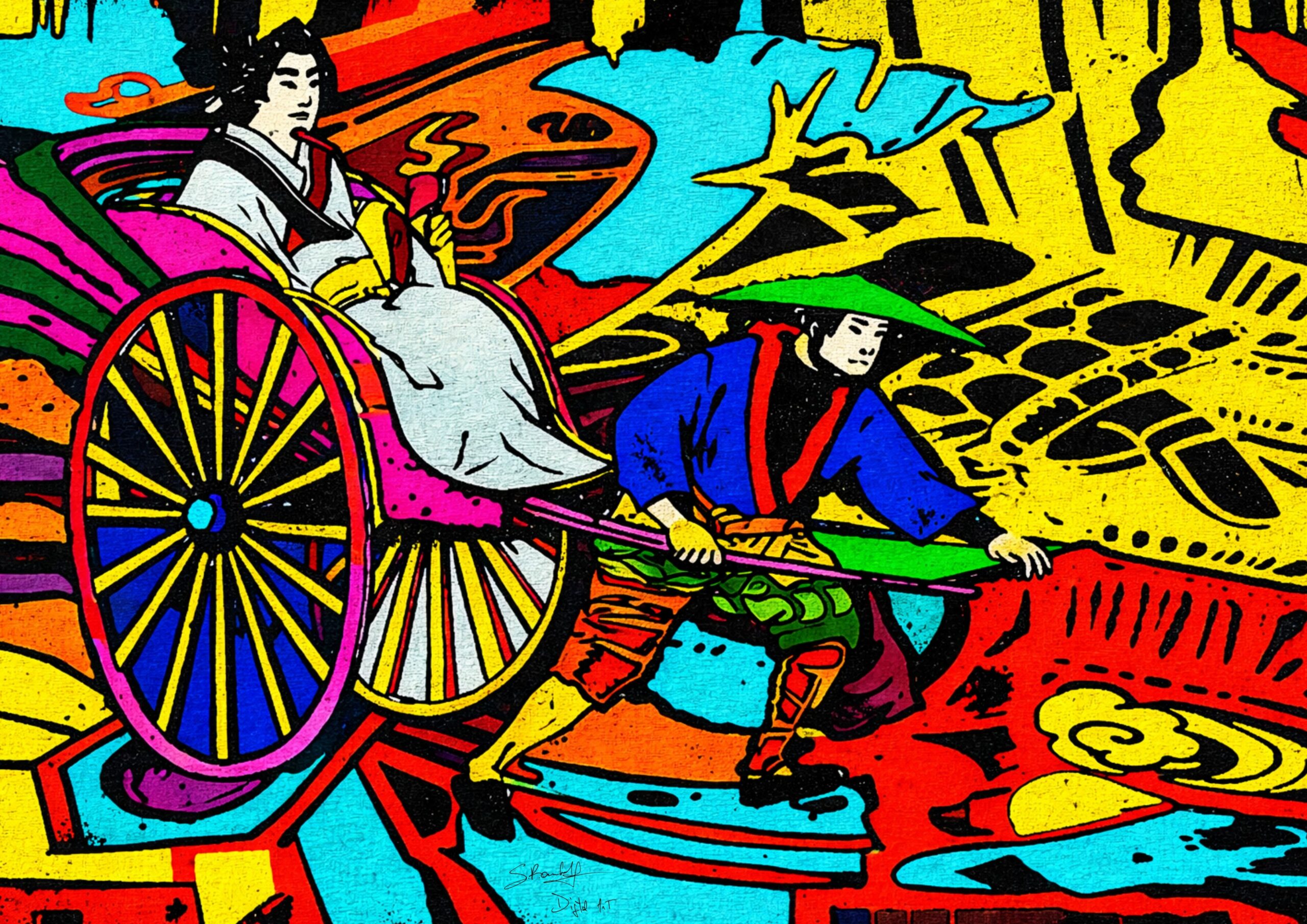 Qui ho lavorato sul movimento, anche se tutto sembra fermo. Il corpo che tira il risciò è tensione pura, mentre la figura seduta resta distante, quasi sospesa in un’altra dimensione. Mi interessa questo squilibrio, questa relazione silenziosa tra chi porta il peso e chi lo attraversa.