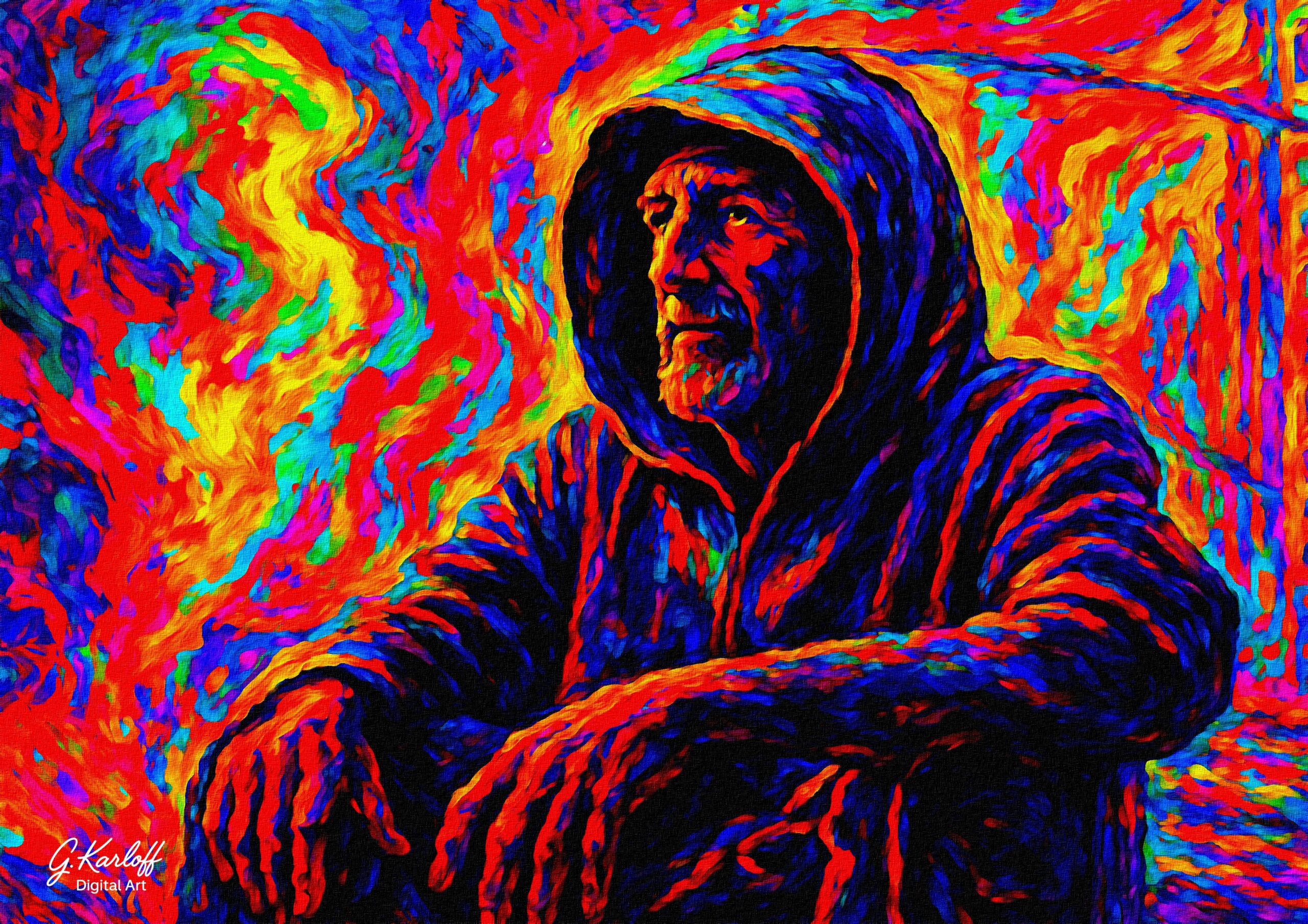 Uomo sulla sedia a rotelle by G. Karloff represents a mature example of digital art, entirely hand-executed on a graphic tablet and subsequently modified with AI, in a conscious dialogue between painterly gesture, technological processing, and inner vision.
